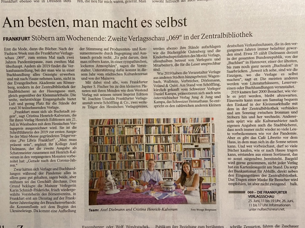 Und wir werden fortsetzen: Derzeit verabreden wir den Ort, an dem erneut an einem Samstag plus Sonntag die nächste 069 Frankfurter Verlagsschau stattfinden wird, vermutlich nach der Sommerpause. – Interessenten schreiben uns gerne eine Mail, damit wir sie auf dem Laufenden halten können.